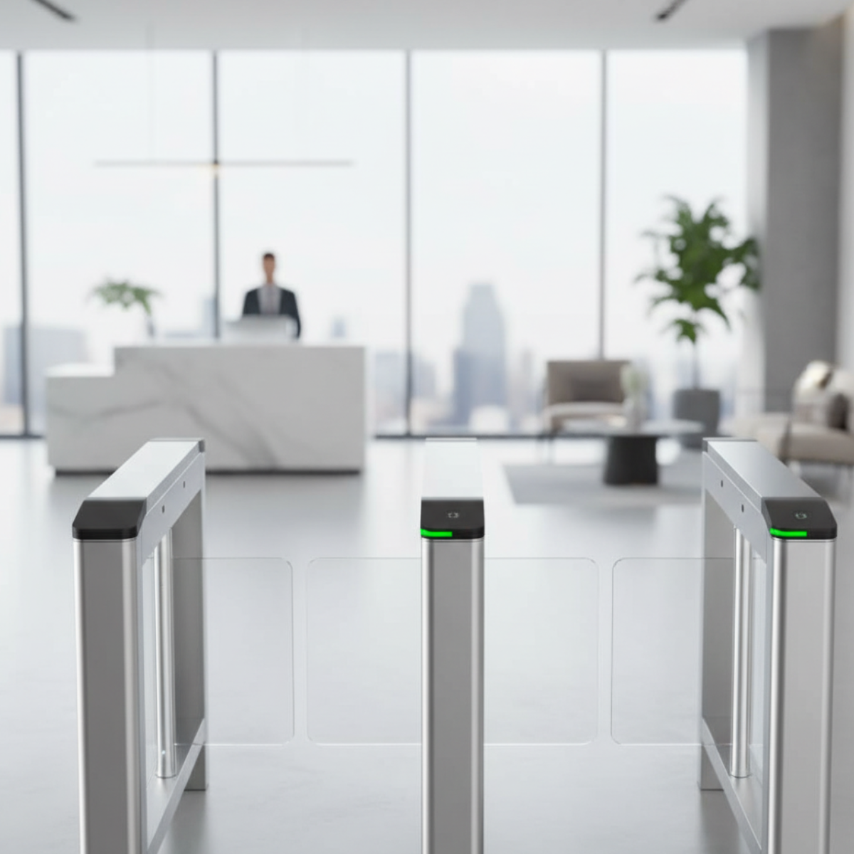 A Swing Barrier se integra à arquitetura, funcionando como uma peça de design tecnológico.