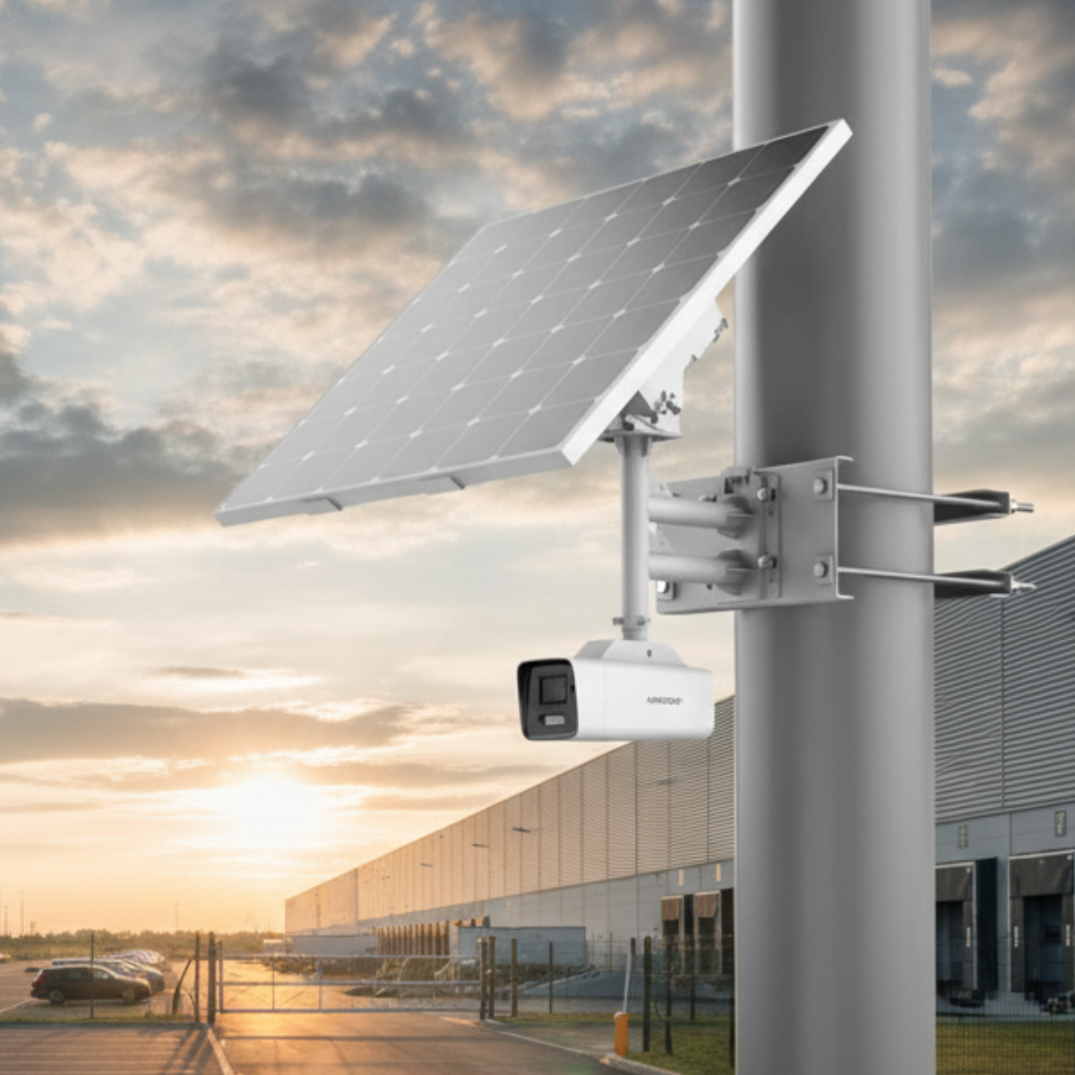 Monitore áreas remotas sem energia ou Wi-Fi. O kit completo com Painel Solar, Bateria e Conectividade 4G oferece imagens coloridas Ultra HD 4K dia e noite, com detecção inteligente de intrusos.