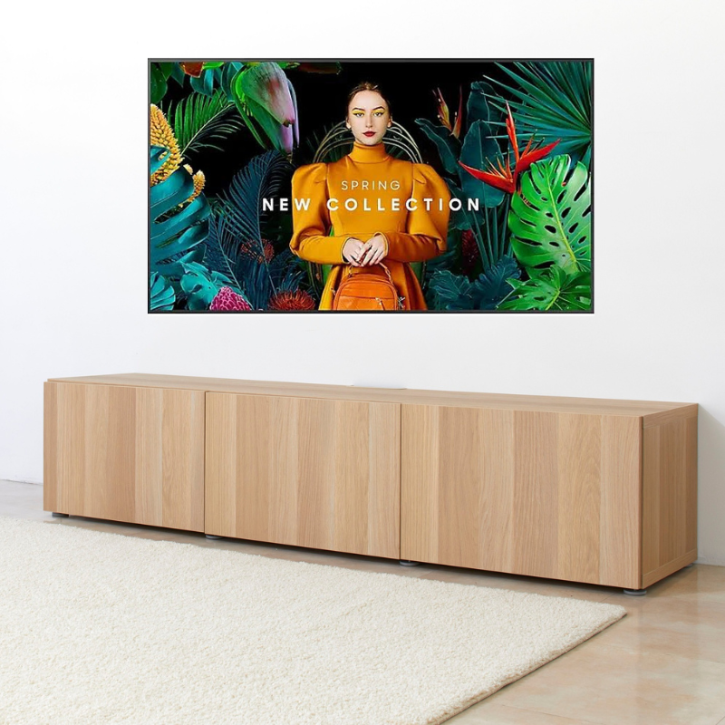 Com uma profundidade de apenas 28.5mm e design simétrico, o monitor QMC pode ser instalado rente à parede, proporcionando uma aparência limpa e sofisticada.