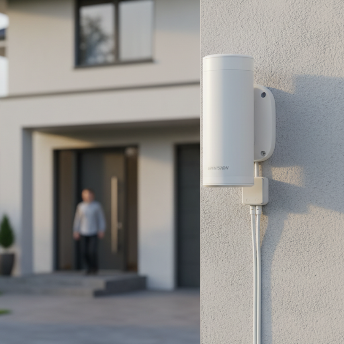 O Sensor de Presença Sem Fio DS-PDTT15AM-LM-WE da Hikvision oferece segurança externa de nível profissional, eliminando alarmes falsos e resistindo a intempéries.
