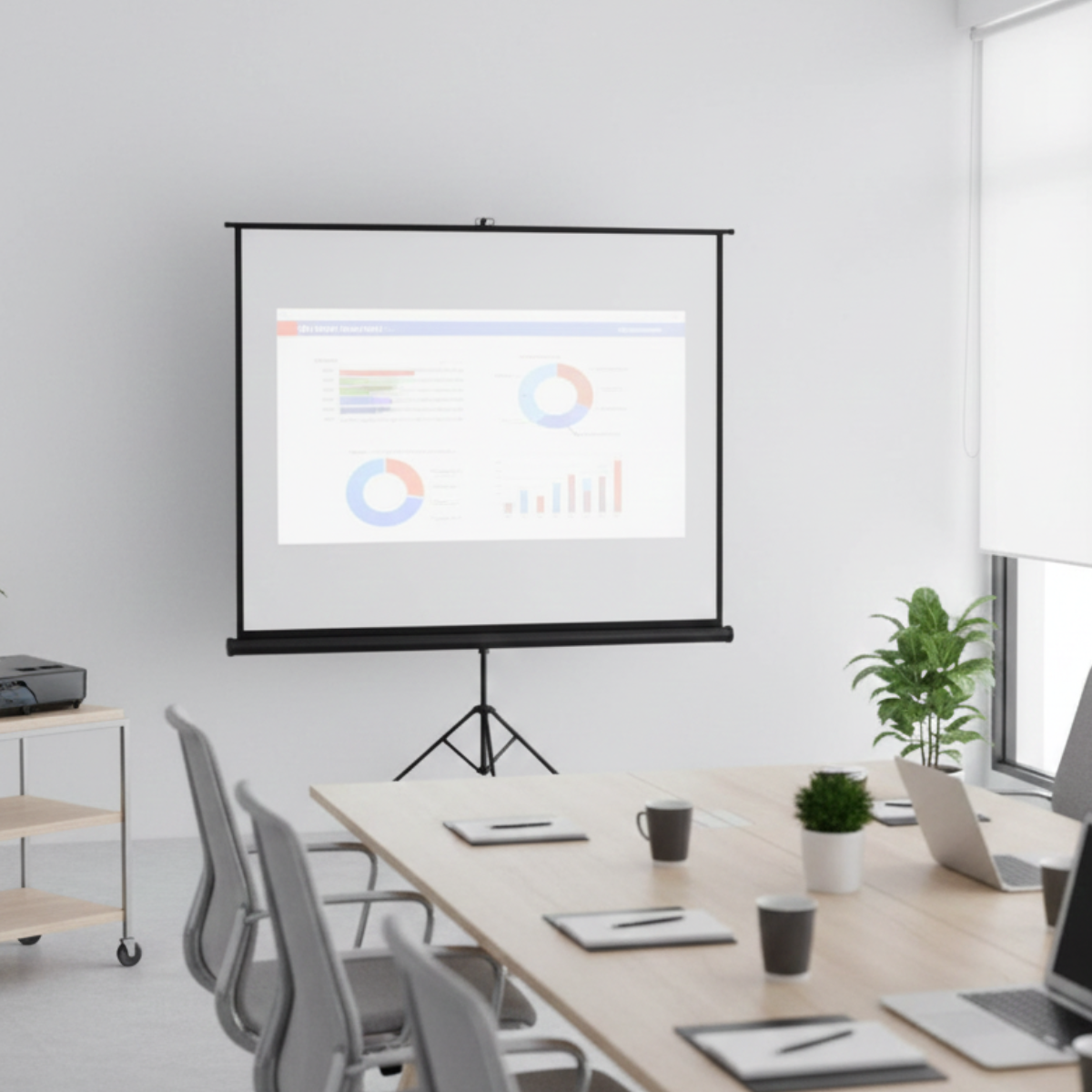 Uma tela gigante de 1,80m x 1,80m que garante visibilidade para todos na sala. Projete filmes, slides e gráficos com impacto visual impressionante.