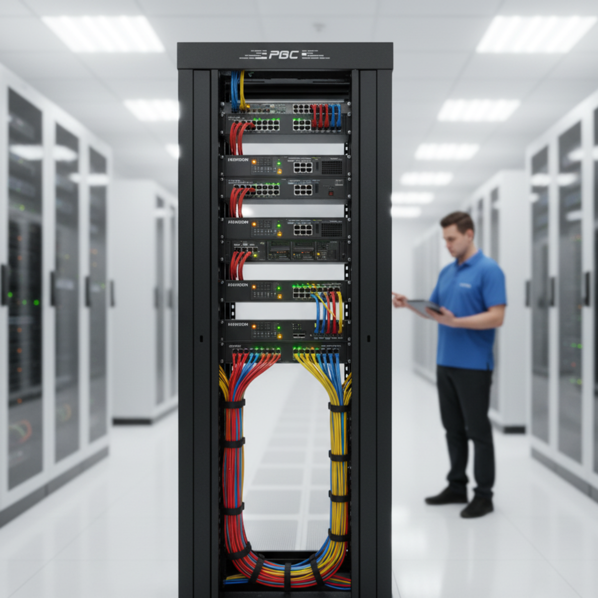 "O acesso total que o frame aberto oferece é um divisor de águas. Não perdemos mais tempo em intervenções de emergência. A profundidade de 450mm foi perfeita para nossos patch panels e organizadores."
